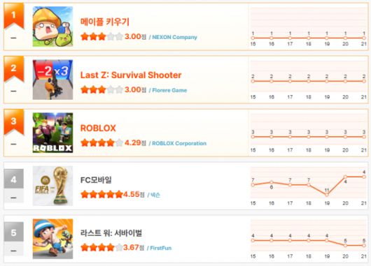정상을 끊임없이 위협하던 ‘라스트Z: 서바이벌 슈터’와 ‘로블록스’는 이번 주에도 각각 2위와 3위에 머물렀다. 두 게임 모두 꾸준한 유저층을 바탕으로 메이플 키우기를 압박하고 있지만, 결정적인 한 방은 아직 부족한 모습이다.