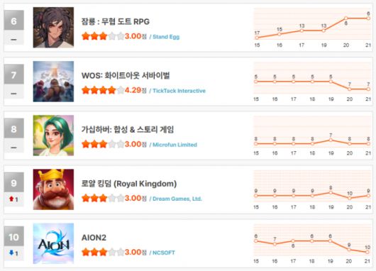 중위권에서는 큰 폭의 상승보다는 소폭 조정이 이어졌다. ‘WOS: 화이트아웃 서바이벌’, ‘가십하버: 합성 & 스토리 게임’, ‘로얄 킹덤’ 등은 전반적으로 순위가 조금씩 하락하며 숨 고르기에 들어간 모습이다. 한때 정상 도전 가능성까지 거론됐던 ‘아이온2’는 10위에 턱걸이하며 체면을 유지했지만, 언제든 다시 치고 올라올 수 있는 잠재력은 여전히 경계 대상이다.