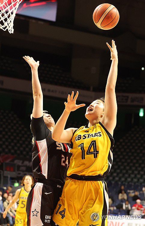 (부산=연합뉴스) 강선배 기자 = 22일 부산 사직실내체육관에서 열린 2025~2026시즌 여자프로농구 부산 BNK 썸과 청주 KB스타즈 경기. KB스타즈 송윤하가 골밑슛하고 있다. 2025.12.22