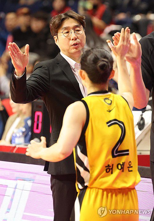 (부산=연합뉴스) 강선배 기자 = 22일 부산 사직실내체육관에서 열린 2025~2026시즌 여자프로농구 부산 BNK 썸과 청주 KB스타즈 경기. KB스타즈 김완수 감독이 경기전 허예은 선수와 하이 파이브 하고 있다. 2025.12.22