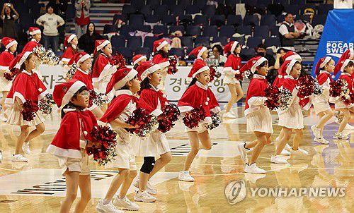 (부산=연합뉴스) 강선배 기자 = 22일 부산 사직실내체육관에서 열린 2025~2026시즌 여자프로농구 부산 BNK 썸과 청주 KB스타즈 경기에서 중간 휴식 시간 때 드림아이 어린이 응원단이 산타 복장을 하고 율동을 선보이고 있디. 2025.12.22