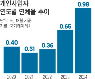 문제는 연체율이다. 지난해 12월 기준 개인사업자(자영업자)의 연체율은 0.98%로 역대 최고치를 기록했다. 전년 대비 증가폭도 역대 가장 크다.
