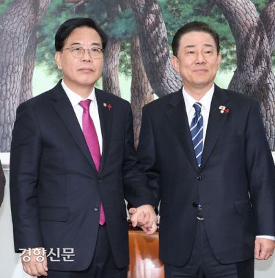 여야 원내대표 논의 시작 김병기 더불어민주당 원내대표(오른쪽)와 송언석 국민의힘 원내대표가 22일 국회 운영위원장실에서 ‘통일교 특검’ 관련 논의를 위한 회동에 앞서 손을 잡고 있다. 한수빈 기자 subinhann@kyunghyang.com |