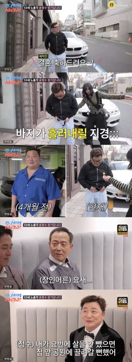 윤정수는 결혼식 당일 메이크업 숍을 찾았다. 결혼식을 앞두고 살을 많이 뺐다는 윤정수는 흘러내리는 바지를 치켜 올렸으며 홀쭉해진 뱃살을 자랑했다. 윤정수는 총 27kg을 감량했다고 밝히며 “105kg에서 시작했다”라고 설명했다.
