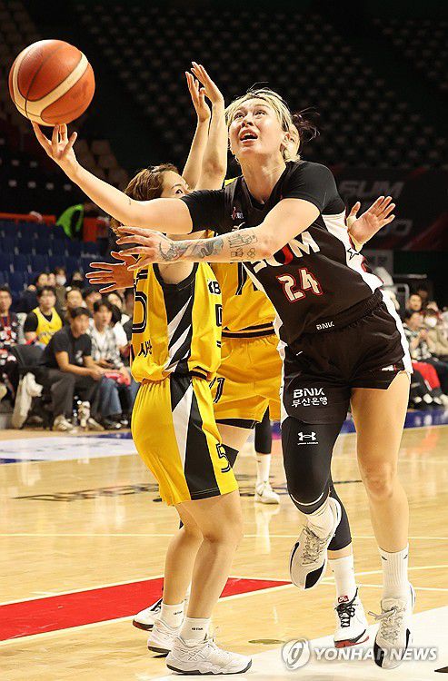(부산=연합뉴스) 강선배 기자 = 22일 부산 사직실내체육관에서 열린 2025~2026시즌 여자프로농구 부산 BNK 썸과 청주 KB스타즈 경기. BNK 김소니아가 슛하고 있다. 2025.12.22