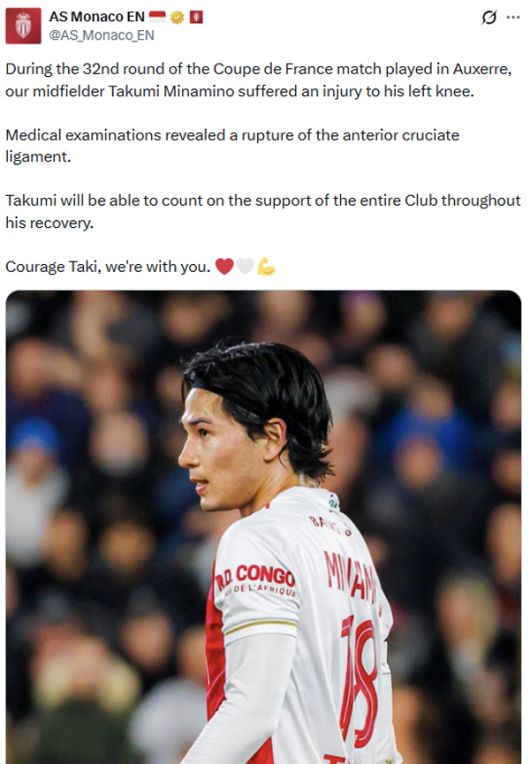 모나코는 "미나미노는 지난 오세르와의 2025~2026시즌 쿠프드프랭크 32라운드에서 왼쪽 무릎 부상을 입었다"며 "의료 검진 결과, 전방십자인대 파열로 진단됐다. 미나미노는 회복 기간 동안 구단의 지원을 받을 것"이라고 발표했다.