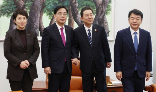김병기 더불어민주당 원내대표와 송언석 국민의힘 원내대표가 22일 국회에서 '통일교 특검', '민생법안 처리' 등 현안 관련 회동을 하고 있다. 왼쪽부터 김은혜 국민의힘 원내정책수석부대표, 송 원내대표, 김 원내대표, 문진석 더불어민주당 원내운영수석부대표. 뉴시스 |