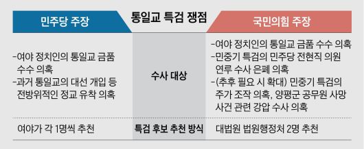 민주당과 국민의힘·개혁신당이 모두 “여야 가리지 말고 통일교 특검을 추진하자”고 하면서, 쟁점은 특검 추천 방식과 수사 대상이 될 것이란 전망이 나온다. 민주당과 국민의힘은 이날 통일교 특검 등에 관해 회동한 뒤 “통일교 특검은 각자 법안을 제출하고 협의해서 신속하게 실행하기로 합의했다”고 했다.
