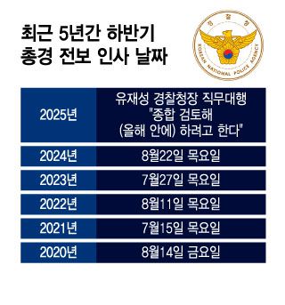 한 총경급 경찰관은 "조직이 계엄과 관련해 경찰을 대상으로 수사 중인 사건조사도 크게 진전이 없는 상황이라 인사가 크긴 어려울 것같다"면서도 "하반기 퇴직자들이 있는 주요 보직을 비울 수는 없는데 인사가 늦어지고 있다"고 했다.