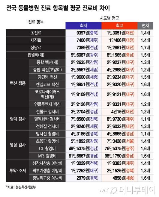 전국 동물병원 진료비가 지역별로 최대 1.7배 차이 나는 것으로 나타났다. 특히 고가 진료항목인 CT(컴퓨터단층촬영)와 MRI(자기공명영상)에서 지역간 진료비 격차가 두드러졌다.