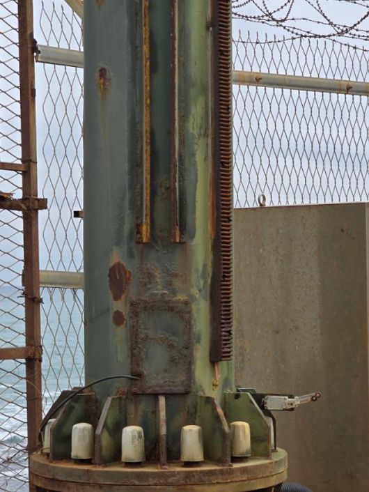 경북 포항시 북구 청하면 이가리 바닷가에 설치된 군부대의 열상감시장비(TOD) 거치대 철제 기둥과 레일에 잔뜩 녹이 슬어 있고, 기어 일부는 파손돼 있다. A사의 랙기어 방식인 이 거치대는 2021년 포항시 기부채납으로 설치됐다. 독자 제공 |