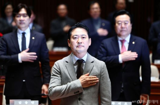 [서울=뉴시스] 김명년 기자 = 장동혁 국민의힘 대표가 8일 오전 서울 여의도 국회에서 열린 의원총회 및 이재명 정권 독재악법 국민고발회에서 국민의례하고 있다. 2025.12.08. kmn@newsis.com /사진=김명년 |