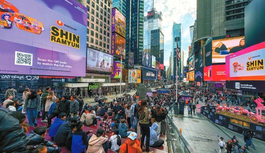 올해 농심은 신라면 글로벌 슬로건 ‘Spicy Happiness In Noodles’를 선포하며 해외 공략을 가속했다. 사진은 미국 타임스퀘어 디지털 옥외광고에 신라면과 인기 애니메이션 ‘케이팝 데몬 헌터스’의 협업 광고가 송출되는 모습. [사진 농심] |