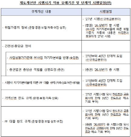 상호금융권은 총 대출의 20%까지만 PF 대출을 해줄 수 있으며, 부동산·건설업 대출 한도까지 합해 총 대출의 50% 이내로 관리해야 한다. 여신 금융 전문 회사(여전사)의 경우 PF·부동산업·건설업 각각 신용공여 자산의 30%, 합산으론 50%까지만 가능하다. 증권사들은 내년 상반기, 나머지 업권은 2027년부터 시행된다.