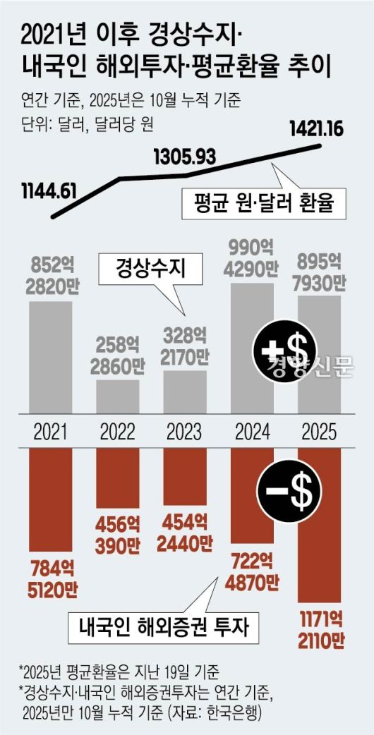 국가데이터처에 따르면 지난달 소비자물가지수는 1년 전보다 2.4% 상승했다. 특히 한국은행 통계를 보면, 11월 원화 기준 수입물가지수는 지난 6월 대비 6.05% 올랐지만 달러 기준으론 -0.56% 내렸다. 즉, 실제 수입하는 물건의 국제 가격은 하락했지만 환율 영향으로 국내 가격은 6%나 올랐다는 뜻이다. 11월 평균환율은 달러당 1460.44원으로, 연중 평균환율이 가장 낮았던 지난 6월(1365.15)과 비교해 6.98% 상승했다.