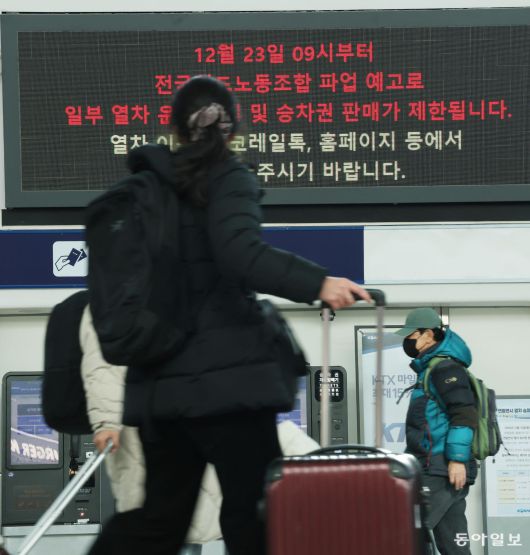22일 오후 서울역 내 전광판에 전국민주노동조합총연맹(민노총) 산하 전국철도노동조합(철도노조) 파업으로 일부 열차가 감축 운행되고, 승차권 판매도 제한된다는 안내가 띄워져 있다. 신원건 기자 laputa@donga.com |