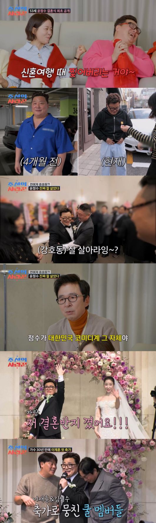 한편, 방송 최초로 윤정수의 결혼식이 공개됐다. 4개월 전, 처음으로 '조선의 사랑꾼' 문을 두드렸던 때와 비교해 총 27kg 감량으로 다이어트에 성공한 윤정수의 모습은 감탄을 자아냈다. 타계한 부모님을 대신에 혼주석을 채워 주실 외삼촌 부부와 처가를 향한 윤정수의 다정다감한 모습이 공개됐다.