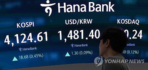 (서울=연합뉴스) 김주형 기자 = 23일 오전 서울 중구 하나은행 본점 딜링룸 현황판에 코스피가 표시돼 있다. 코스피는 전장보다 14.55포인트(0.35%) 오른 4,120.48에 거래되고 있다. 원/달러 환율은 0.1원 내린 1,480.0원에 개장했다. 2025.12.23