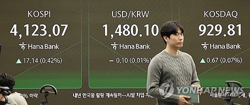 (서울=연합뉴스) 김주형 기자 = 23일 오전 서울 중구 하나은행 본점 딜링룸 현황판에 코스피가 표시돼 있다. 코스피는 전장보다 14.55포인트(0.35%) 오른 4,120.48에 거래되고 있다. 원/달러 환율은 0.1원 내린 1,480.0원에 개장했다. 코스닥은 0.76포인트(0.08%) 오른 929.90이다. 2025.12.23