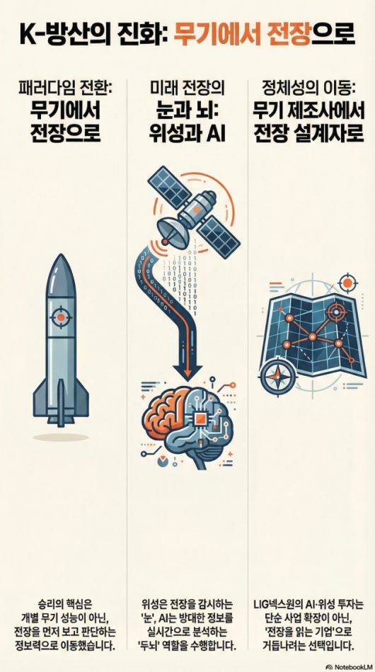 LIG가 보여주는 위성과 AI로의 이동은, 이 질문에 대한 하나의 현장 답변이다. 방산의 다음 단계는 무기를 더 잘 만드는 것이 아니라, 전장을 먼저 읽고 판단하는 능력이라는 인식이다.
