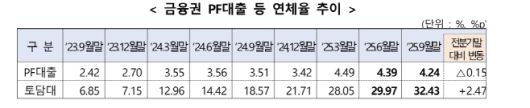 금융위 관계자는 "부실PF 규모 감소세가 유지될 수 있도록 경영진 면담과 부실감축 계획 이행점검 등을 통해 부실PF 사업장에 대해 상시적으로 정리·재구조화를 추진해 금융사 건전성 관리를 강화할 것"이라고 말했다.