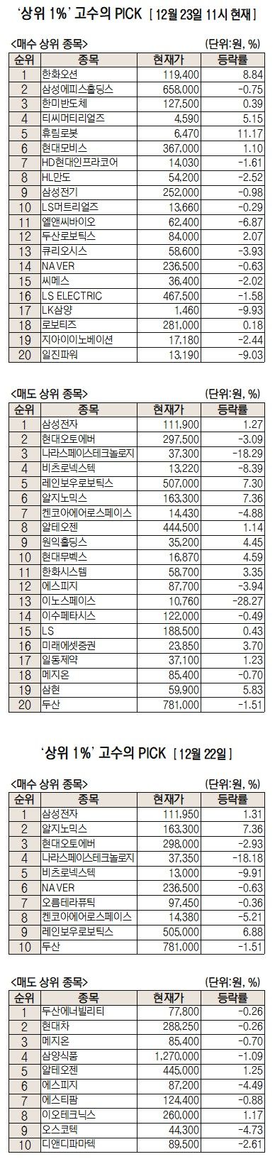 미래에셋증권에서 거래하는 고수익 투자자들이 23일 오전 가장 많이 순매수한 종목은 한화오션(042660), 삼성에피스홀딩스(0126Z0), 한미반도체(042700) 순으로 집계됐다.