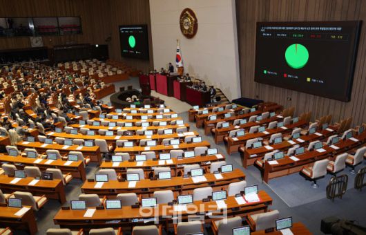 [이데일리 노진환 기자] 23일 서울 여의도 국회에서 열린 제430회국회(임시회) 제2차 본회의에서 ‘12·3 윤석열 비상계엄 등에 대한 전담재판부 설치 및 제보자 보호 등에 관한 특별법안(대안)에 대한 수정안’이 가결되고 있다.