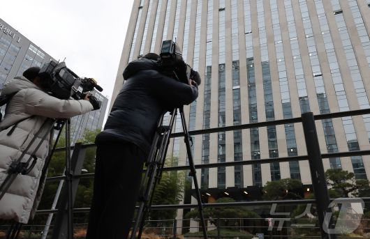 (서울=뉴스1) 장수영 기자 = '쿠팡 퇴직금 미지급 무혐의 외압' 의혹을 수사하는 관봉권·쿠팡 상설 특검팀이 23일 서울 송파구에 위치한 쿠팡풀필먼트서비스에 대한 압수수색에 착수한 가운데 취재진이 현장에 대기하고 있다. 2025.12.23/뉴스1