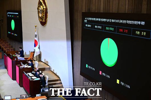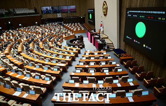 [더팩트ㅣ국회=남윤호 기자] 23일 오전 서울 여의도 국회에서 열린 본회의에서 12.3 윤석열 비상계엄 등에 대한 전담재판부 설치 및 제보자 보호 등에 관한 특별법안(대안)에 대한 수정안이 재석 179인에 찬성 175인, 반대 2인, 기권 2인으로 가결되고 있다.