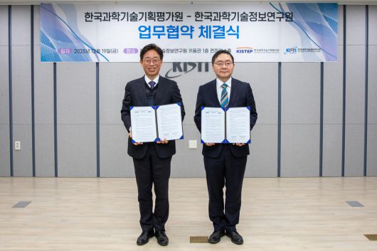 이달 19일 대전 유성구 한국과학기술정보연구원(KISTI) 키움관 콘퍼런스홀에서 개최된 한국과학기술기획평가원(KISTEP)·KISTI 업무협약식. 오태석 KISTEP 원장(왼쪽)과 이식 KISTI 원장.(KISTEP 제공) |