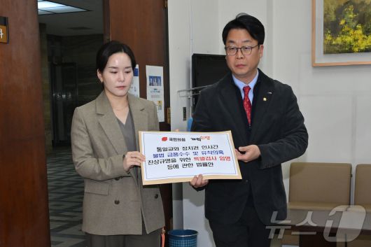 (서울=뉴스1) 이승배 기자 = 곽규택 국민의힘 원내수석대변인과 이주영 개혁신당 정책위의장이 23일 서울 여의도 국회 의안과에 ‘통일교와 정치권 인사 간 불법 금품수수 및 유착 의혹 진상규명 특검법’을 제출하고 있다. (공동취재)photolee@news1.krCopyright ⓒ 뉴스1. All rights reserved. 무단 전재 및 재배포, AI학습 이용 금지.