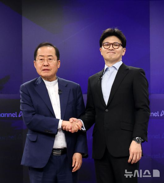 [서울=뉴시스] 국회사진기자단= 25일 오후 종로구 동아미디어센터 채널A스튜디오에서 국민의힘 대선 2차 경선 진출자인 한동훈, 홍준표(왼쪽) 후보가 기념촬영을 하고 있다. 일대일 맞수 토론은 2차경선 진출자 4명이 일대일 맞수토론 형식으로 진행된다. 2025.04.25. photo@newsis.com |