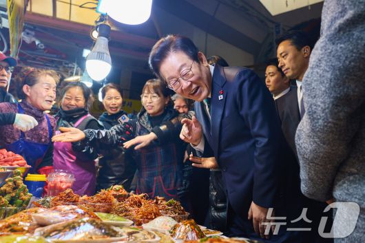 (서울=뉴스1) 이재명 기자 = 이재명 대통령이 23일 부산 진구 부전시장을 찾아 상인들과 대화하고 있다. (대통령실 제공. 재판매 및 DB 금지) 2025.12.23/뉴스12expulsion@news1.krCopyright ⓒ 뉴스1. All rights reserved. 무단 전재 및 재배포, AI학습 이용 금지.