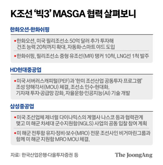 HD현대중공업과 삼성중공업는 현지 업체와 협력체계를 구축하고 있다. HD현대중공업 관계자는 “트럼프 대통령은 ‘함정이 지금 당장 필요하다’고 언급했는데, HII와 이미 협력 관계를 맺고 있어 건조기술 지원 등을 준비하고 있다”며 “이밖에 미국 서버러스캐피털(PEF)과 함께 현지 조선소를 인수하는 방안 등도 검토 중”이라고 밝혔다. 삼성중공업 관계자는 “미국 현지 조선사 나스코 등과 미 해군 차세대 군수지원함(NGLS) 사업의 공동 입찰에 참여할 계획을 세우고 있다”고 말했다.