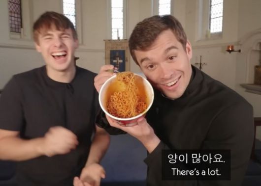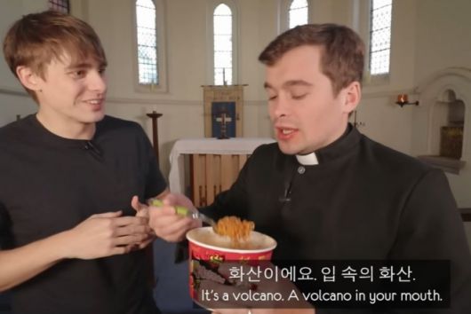 유튜브 채널 ‘영국남자’에 출연해 불닭볶음면을 먹는 영국 성공회 크리스 리 신부(오른쪽). 영국남자 캡처. |