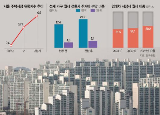 임대차시장에서는 전세의 월세화가 뚜렷하다. 전국 주택 임대차 거래 가운데 월세 비중은 올해 10월 60.2%까지 상승해 장기 평균을 크게 웃돌았다. 전세사기 여파로 보증금 반환 리스크가 부각된 데다 전세자금대출 규제 강화와 임대인의 월세 선호 확대가 복합적으로 작용한 결과로 분석됐다. 월세 비중 확대는 가계부채 축소와 갭투자 감소라는 순기능이 있지만 저소득층의 주거비 부담을 키울 수 있다는 점에서 부담스러운 요인이다. 전세가 월세로 전환된다고 가정할 때 소득 1분위 가구의 주거비 부담은 현재 소득 대비 17.4%에서 21.2%로 높아지는 것으로 나타났다.