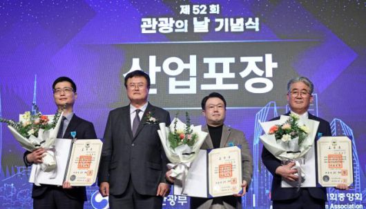 이어 “외래관광객 3000만 명 시대는 더 이상 먼 미래의 이야기가 아니라 지금 우리가 준비해야 할 현실의 과제”라며 “마이스(MICE) 등 고부가가치 관광산업 육성과 K-팝을 비롯한 문화창조산업, 음식·패션·뷰티 산업과의 융합, 지역 관광 활성화는 한국 관광이 한 단계 더 도약하기 위해 반드시 넘어야 할 과제”라고 강조했다. 문체부는 1974년부터 매년 관광산업 발전에 기여한 인사를 선정해 포상하고 있다. 올해는 은탑·동탑·철탑산업훈장을 비롯해 산업포장, 대통령·국무총리 표창 등 총 23명에게 정부 포상이 수여됐다. 은탑산업훈장은 고재경 ㈜노랑풍선 회장이 받았다. 고 회장은 관광 분야에서 650명 규모의 정규직 일자리를 창출하고, 연간 국내 여행객 2만명, 시티투어버스 이용객 9만8000명(외국인 3만4000명)을 유치하며 국내 관광 활성화에 기여한 공로를 인정받았다. 동탑산업훈장은 우기홍 ㈜대한항공 부회장에게 돌아갔다. 약 40년간 항공업계에 몸담아 온 우 부회장은 2024년 매출 17조8707억원의 사상 최대 실적을 이끌며 국적 항공사의 안정적 운영을 통해 대규모 관광객 유입과 외화 획득에 기여했다. 철탑산업훈장은 이정호 ㈜호반호텔앤리조트 대표이사가 수훈했다. 이 대표는 2024년 매출 2383억원을 달성하고, 관광 인력 양성을 위해 46개 교육기관과 산학협력을 체결했다. 신규 채용 204명을 통해 지역 일자리 창출과 지역경제 활성화에도 힘썼다. 이 밖에도 관광산업 발전에 헌신한 공로자 80명이 문체부 장관 표창을 받았으며,외화 획득에 기여한 5개 업체에는 관광진흥탑이 수여됐다.