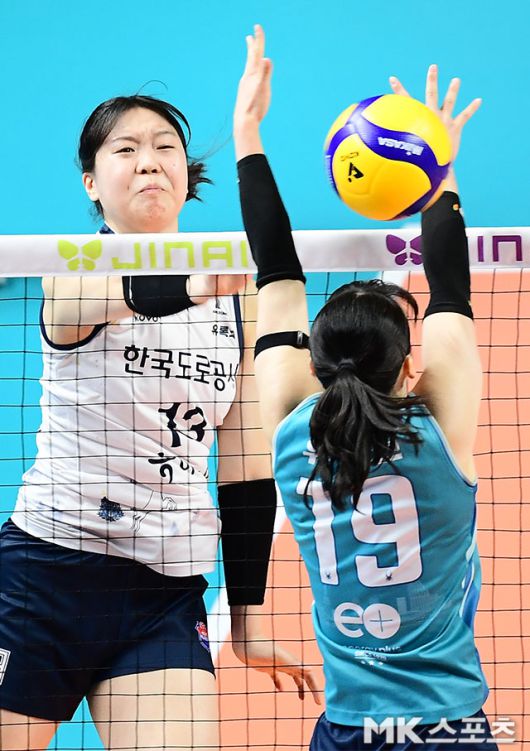 도로공사 이지윤이 상대 블로커를 앞에 두고 스파이크를 날리고 있다.