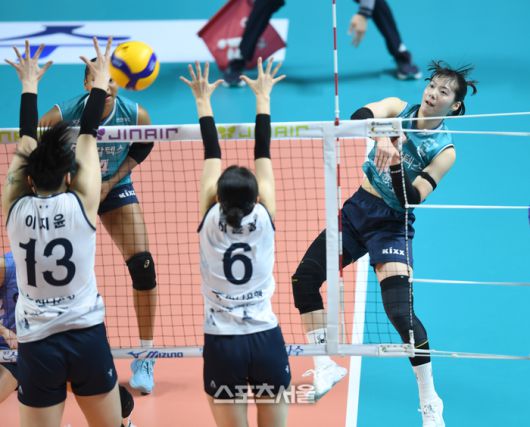 GS칼텍스 유서연이 23일 서울 장충체육관에서 열린 2025~2026 V-리그 도로공사와 경기에서 강타를 날리고 있다.2025. 12. 23.장충 | 최승섭기자 thunder@sportsseoul.com [기사제보 news@sportsseoul.com] Copyright ⓒ 스포츠서울&sportsseoul.com