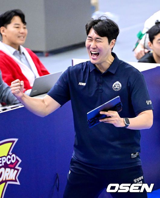 [OSEN=수원, 최규한 기자] 23일 경기도 수원체육관에서 ‘진에어 2025~2026 프로배구 V리그’ 남자부 한국전력과 삼성화재의 경기가 열렸다. 홈팀 한국전력은 8승 7패 승점 22, 방문팀 삼성화재는 2승 14패 승점 7을 마크하고 있다. 1세트를 따낸 삼성화재 고준용 감독대행이 기뻐하고 있다. 2025.12.23 / dreamer@osen.co.kr