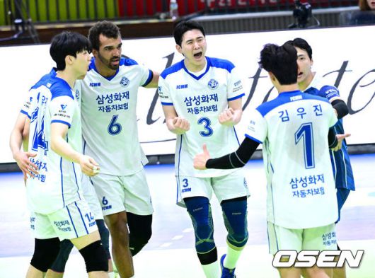 [OSEN=수원, 최규한 기자] 23일 경기도 수원체육관에서 ‘진에어 2025~2026 프로배구 V리그’ 남자부 한국전력과 삼성화재의 경기가 열렸다. 홈팀 한국전력은 8승 7패 승점 22, 방문팀 삼성화재는 2승 14패 승점 7을 마크하고 있다. 3세트, 삼성화재 선수들이 득점에 기뻐하고 있다. 2025.12.23 / dreamer@osen.co.kr