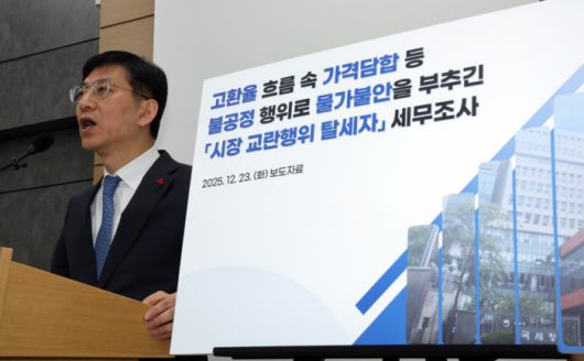안덕수 국세청 조사국장이 23일 정부세종청사 국세청 브리핑실에서 고환율 흐름 속에서 가격담합 등 불공정행위로 물가 불안을 부추긴 시장 교란 행위 탈세자에 대한 강도 높은 세무조사를 실시한다고 설명하고 있다. [연합뉴스] |