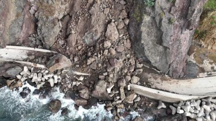 어제(22일) 새벽 3시쯤 경북 울릉군 서면 일주도로 근처 절벽에서 돌 4천 톤이 쏟아져 축대벽과 도로를 덮쳤습니다.