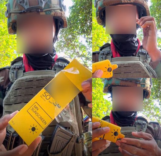 [서울=뉴시스]김수빈 인턴 기자 = 전장 한복판에서 선크림을 홍보하는 캄보디아 병사의 모습이 공개돼 누리꾼 사이 논쟁이 벌어졌다.