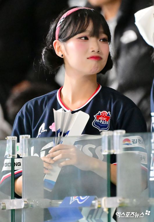 (엑스포츠뉴스 장충, 김한준 기자) 23일 오후 서울 장충체육관에서 열린 '진에어 2025-2026 V-리그' GS칼텍스와 한국도로공사의 경기, 지아영 치어리더가 열띤 응원을 선보이고 있다.김한준 기자 kowel@xportsnews.com