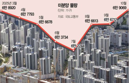 하지만 이 같은 신규 분양 물량 감소에도 미분양 주택은 오히려 증가했다. 10월 말 기준 전국 미분양 주택은 6만 9069가구에 달해 전년 동기(6만 5836가구 대비 4.9% 증가했다. 미분양 주택은 올해 7월까지 감소하다가 8월부터 다시 증가했다. 8월 말 기준 전월 대비 7.0% 증가한 6만 6613가구를 기록한 뒤 △9월 6만 6762가구 △10월 6만 9069 가구로 석 달 연속 증가했다. 특히 '악성 미분양'으로 불리는 준공 후 미분양 주택은 2만 8080가구로 지난 2013년 1월(2만 8248가구) 이후 12년 9개월 만에 최대치를 기록했다.