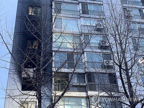 (서울=연합뉴스) 강류나 기자 = 24일 오전 서울 송파구 방이동 한 아파트 5층에서 불이 나 화재 현장 주변이 검게 그을려 있다. 2025.12.24