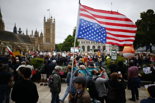 지난 9월 17일 영국 런던에서 도널드 트럼프 미국 대통령의 영국 국빈 방문에 반대하는 시위가 열린 가운데 한 참가자가 미국 성조기를 들고 있다.EPA연합뉴스