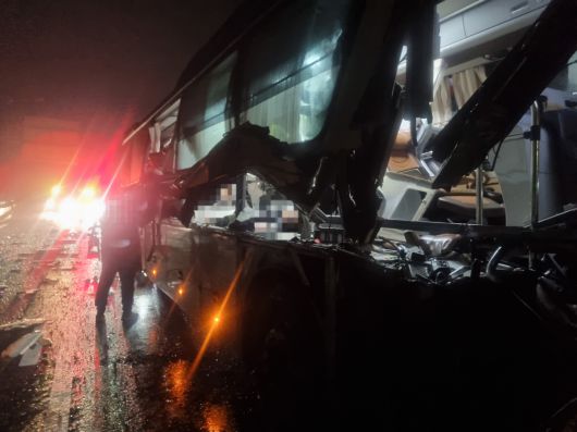 24일 오전 6시 38분쯤 경남 함양군 수동면 통영대전고속도로 대전 방면 수동졸음쉼터 인근에서 1차로로 주행하던 시외버스가 2차로를 달리던 화물차 옆면과 충돌했다.