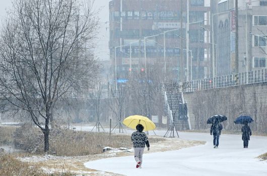 강원 산지와 내륙 곳곳에 대설주의보가 발효된 지난 23일 춘천시 도심 하천 인근에 폭설이 내리고 있다. 연합뉴스. |